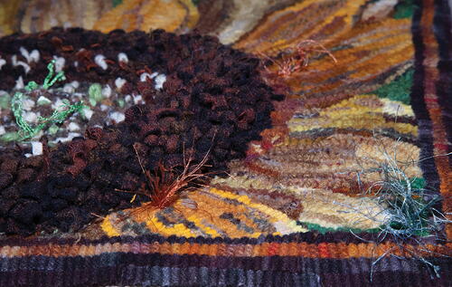 Sunflower Head: #9R Oxford Punch Needle Stretch velvet for the seeds, #10R Doubled 2-ply medium brown yarn, 1 round each of #9R, #8R, and #7 Craftsman Punch Eggplant sari silk, #7-3 CP Novelty Yarn, #2CP 2 rows Faux Fur and 1 row #1CP, 1 row each #3 and 5CP 2 doubled 2 ply dark brown yarn and 1 row #10R doubled 2 ply brown yarn. Petals: #10R outline, #12F sari silk yarn, #8R sari silk, #8R doubled 2-ply yarn, #8 stretch velvet.