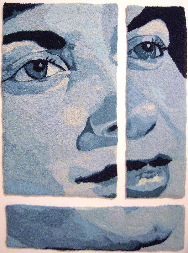 "I thought an extreme close up of a face would be an interesting hooking, treating it as one would a rolling landscape with details of bushes, ponds and crevices. I chose to divide it into three unequal parts and to use blue wool only because it would look cool hanging on my wall. The large expanses between the eyes, nose and mouth were challenging, but as in a rolling lawn, different shades were hooked from dark to light creating hilly contours of cheeks, chin, etc. I love the large scale of Facescape. It could be fun to go even bigger."