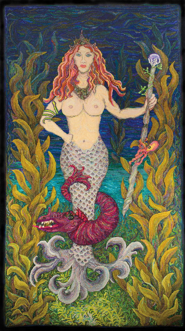 "Yes, I am a water goddess, being raised near the water, swimming every possible moment and navigating the world by the direction of the water. This is Marina, a guardian of the ocean. She is not a weak mermaid but a warrior in protecting the ecology of the ocean that I love. The title has a double meaning. As well as being a guard, she is also being guarded by a sea monster wrapped tightly around her tail. This fierce protective presence is my husband. My children symbolically also appear in the rug. My daughter is the snake wrapped around her arm, and my son is the octopus wrapped around the scepter. At her feet in the deepest depths of the ocean, you will see the light coming from her magical cave."