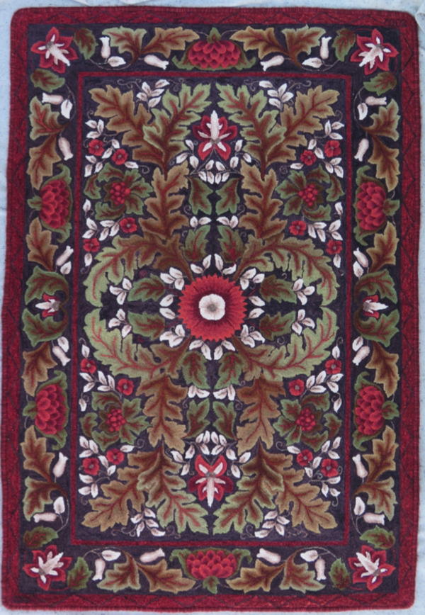 "Masterful Morris is the first rug I did with my teacher Peggy Hannum. It was my first day in her class and she had me look at catalogs to choose a pattern. At the end of class, she asked if I found a pattern I liked and I showed her Masterful Morris. She took a deep breath and said if that is the one that excited me, that is the one I should do. I found out years later that it was the first rug she color-planned!