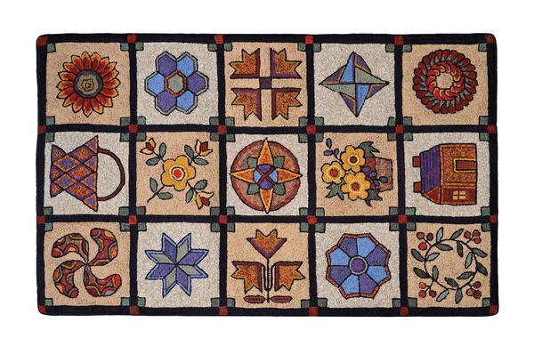 "I designed this and gave it to Honey Bee Hive, thinking I would never get to it and maybe someone could benefit. I signed up for my annual vacation to Ohio Rug Camp and realized no project was crying out to go with me. Fifteen squares and each one had to conform to the basic color plan as well as create a rhythm in the overall pattern. In the photo, what appears black is in fact a very deep purple, thanks to Anne Bond. Each square is actually like a little rug in itself, so the hooking was never tedious and it worked up very quickly."