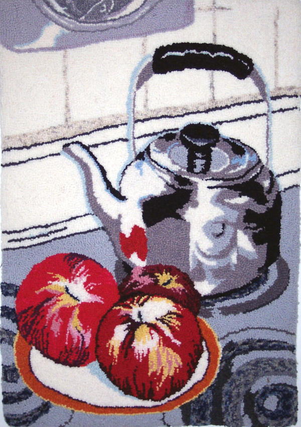 "In Still Life #3 with Teapot, my goal was to capture the shine and reflections on my favorite metal teapot using blocks of bold color instead of resorting to metallic fabric or thread which doesn’t work. I love this still life, which was set up on my kitchen stove, for its composition of repeating circles. I use objects found mostly around my home for my still lifes. I see now I had a few problems with perspective in this piece that weren’t noticed while I was hooking it. I was pleased that I accomplished what I set out to do."