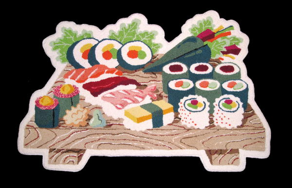 "My goal in this particular rug was to make each piece of sushi (some of my favorites) recognizable to the viewer. Top left to right, fotomaki and tuna hand roll. At the bottom left is tobiko with quail egg, and at the center, top to bottom, are salmon, tuna, shrimp, and omelet sushi. Finally, at the bottom right, top to bottom, are a tuna roll, salmon and cucumber roll, and a California roll. Looks delicious all these years later."