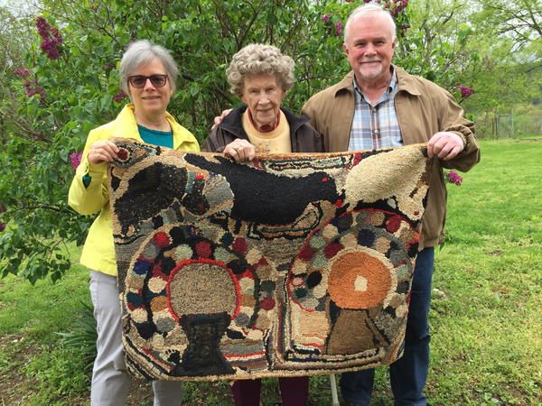 In the photo are Gregg Jacobs (great-great-grandson of Magdalena), Ellen Jacobs (great-granddaughter of Magdalena, who incidentally just turned 100 years old!), and Debra Smith, editor of Rug Hooking magazine (resident of Perry County and fan of Magdalena and her work).