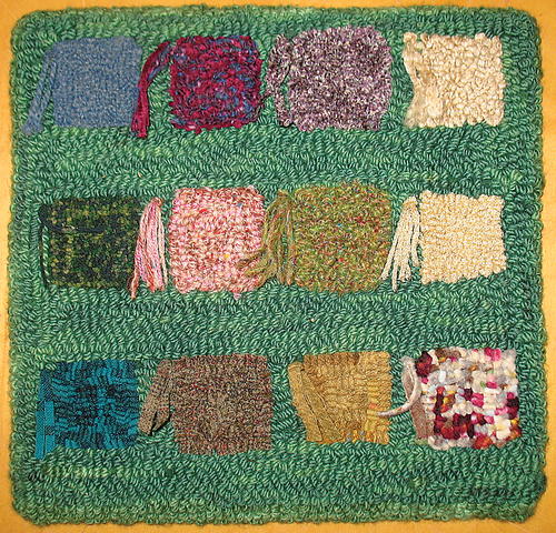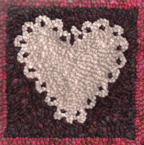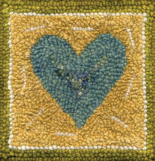 Valentine, 8" x 8" square table mat or wall hanging. Available as a kit (pattern and hand-dyed wool rug yarn), or as a pattern only (hand drawn on monk's cloth). To order, call 717-823-0206, or e-mail edenvillagerugs@comcast.net.