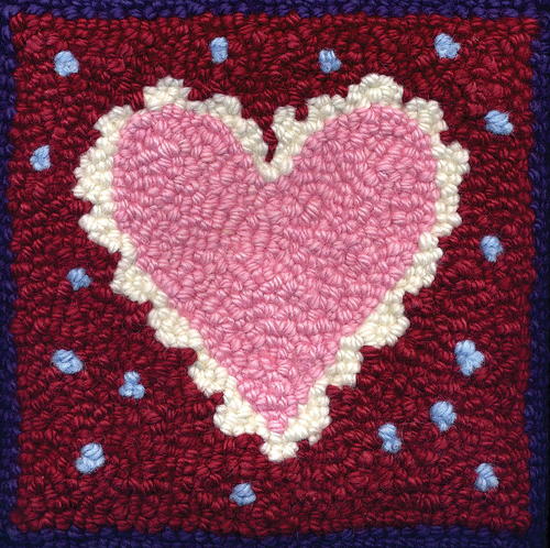 Louise Kulp designed a kit that many Oxford teachers used for the 2010 International Punch Needle Hooked Rug Day. Valentine, sold through her business Eden Village Rugs, is a versatile pattern that lends itself to customization by mixing and matching design elements. Try polka dots, hidden shapes, or a rich solid color peeking through the lacy holes of a frilly heart to makek the mat truly your own—or make it for your valentine.
