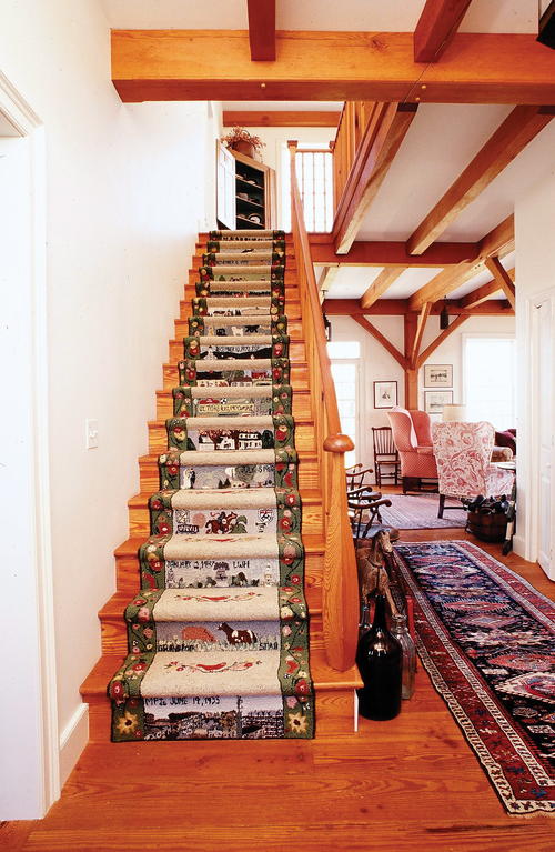 Pierson Family Stair Runner, 24' long x 30" wide. Wool rug yarn on monk's cloth. Designed by Amy Oxford and punch by Amy with help from sisters Hamida, Hanka, and Sabaheta Dzankovic. Each of the 16 risers represents an important part of the family's life including birthplaces, childhood horses, schools and colleges, family pets, different homes they have lived in over the years, children, hobbies and important life events such as a wedding, a graduation, and a house-raising party. The runner was made in three sections, took 6 months to design and 6 months to punch. Made with a Craftsman Punch Needle set to #9 and wool rug yarn. (This rug was made in 1995, just before the invention of the Oxford Punch Needle.) Collection of Mitchell and Louisa Pierson, Victor, NY. Photo by Amy Oxford.