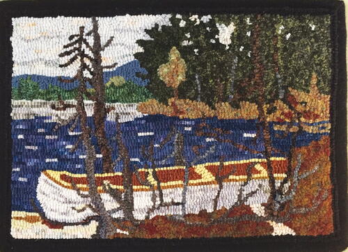 I planned to hang this pattern but didn’t want the expense of a professional frame. So I mounted it myself using very inexpensive materials. This is how you can do it too. For my frame I used the same black Dorr wool that I used for the last two rows of hooking. If you want the frame to stand out a bit, use a contrasting color.