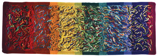 Rainbow, 47 1 /2" x 17 1 /2", #3- to #6-cut wool on rug warp. Designed and hooked by John Leonard, Wilmington, North Carolina, 2021. -