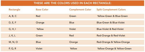 - The complement is the color directly across the color wheel. The complement of red is green. Red and green create a two-color, complementary color scheme. Hook two complementary colors in each area of your rug. The first rectangle could contain red and green values. An adjacent rectangle might have orange and blue values, the next adjacent area, yellow and violet, followed by green and red, then blue and orange, and the last, violet and yellow, or—rather than arranging the colors according to the color wheel—place them in any order you would like.