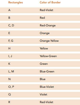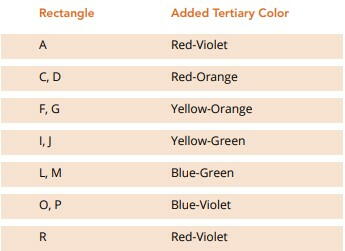Be sure that the base color is the main color in rectangles B, E, H, K, N, and Q. For example, most of the wool used in rectangle B is red. To create more interest in the rug, I added tertiary colors (red-orange, yellow-orange, yellow-green, blue-green, blue-violet, red-violet) to bridge the primary colors (red, yellow, and blue) and secondary colors (red, orange, yellow, green, blue, and violet). I added these tertiary colors to create transitional colors between the base colors. The tertiary colors bridging primary colors and secondary colors add interest to the rug. For example, red-orange in rectangles C and D shows the transition from red to orange.