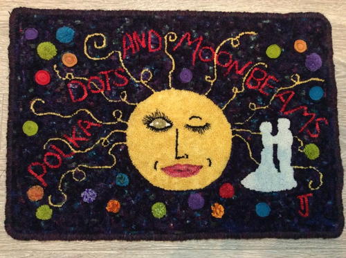 “A country dance was being held in a garden” is the opening lyric of “Polka Dots and Moonbeams”, written and first published in 1940. I know those lyrics well as my dad played that vinyl 33 record at least 500 times. We’d listen to Frank Sinatra singing it in the early 1950s on Saturday mornings when he did not have to go to work. I rediscovered the song when John Denver performed it in 1976 and it has remained one of my favorite songs.” The background is a wonderful dark navy/purple with colored flecks. It was dyed by Karen Duncklee. Some polka dots are sculpted, some are quillies, some are regular hooking. -