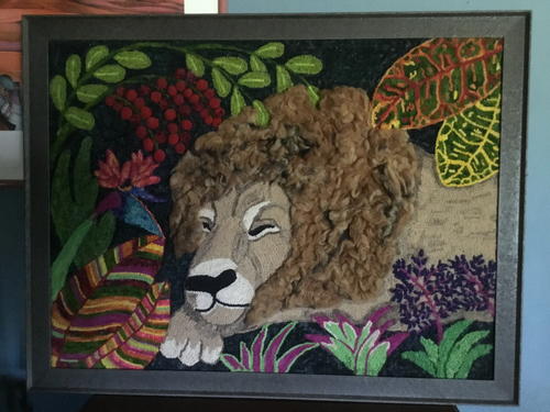 The Lion Sleeps Tonight, 41" x 53”, wool, yarn, and roving on linen. Hooked, sculpted and needle felted. Designed and hooked by Rita Hood, 2018.