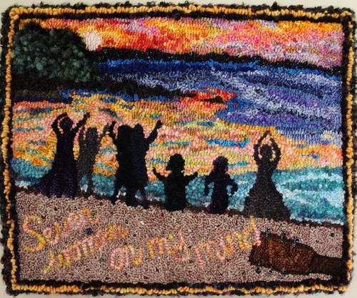 Five of my girlfriends and I visit him at his cottage every summer. We’ve been friends for over 40 years. I hooked the sunset that we see every evening from the beach. The frolicking women are randomly hooked to be left to his imagination. The neck of the guitar represents him sitting on the beach playing, as he does. I know that he will recognize the place immediately.” -
