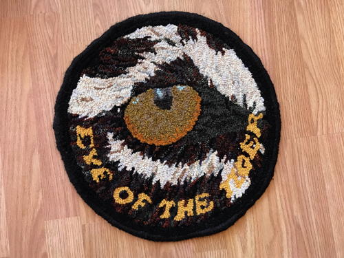 I love animals. I’ve painted some before and wanted to hook an animal (especially after getting Judy Carter’s book). I was intrigued by the song challenge and it didn’t take long for the idea of Eye of the Tiger to form. I wanted it to look like a record. On the outside edge I used the up and down technique to imitate the ridges of a vinyl record. -