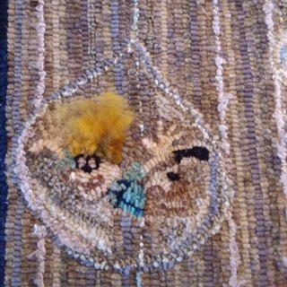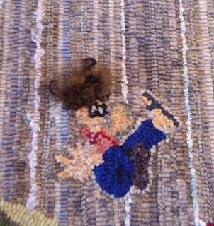 I heard this song on a 1070s station and could not get it out of my head. So when I got home I sat down at my design table and started drawing. I looked at pictures of lions and researched tropical plants of Africa and my rug started to come to life. I used five colors of roving to needle felt the mane. Then I went into the dye pot and dyed his body colors. With careful thinning and trimming here and there, his mane developed. I found a great yarn in my stash to use on the fluffy purple flowers on the bottom right of the rug. The red berries are Waldoboro to give them some height so they would not get lost next to Leo. For the background, I developed a great black, green, and blue spot dye. When the lighting is just right one can see the sparkles, like little fireflies, flying all around in the night sky. -