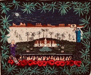 Hotel California by The Eagles, 32" x 39", #3 - 8.5-cut wool on linen, finished with a cord and wool yarn whipped perimeter. Designed and hooked by Kathryn Rutherford, 2018.
