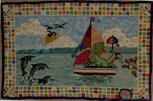 Puff the Magic Dragon, 37 ½” x 56", #5- and 8-cut wool on linen. Designed and hooked by Susan Barnard, 2018.