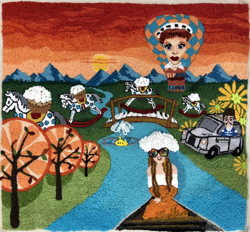 Lucy in the Sky with Diamonds, 30" x 26", yarn on rug warp. Designed and hooked by Kay LeFevre, 2018.