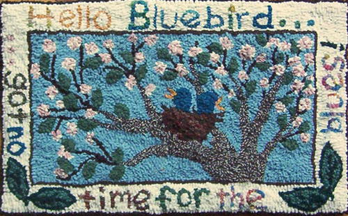 Hello Bluebird, #4- and #6-cut wool on linen. Need dimensions, Designed and hooked by Maureen McIlwain, year?