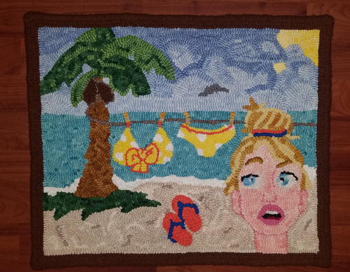 Itsy Bitsy Teenie Weenie Yellow Polka Dot Bikini, 20 ½" x 17 ½”, #6-cut wool on monk’s cloth. Designed and hooked by Dawn Langham, 2019.