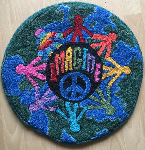 Imagine, 18 ½" diameter, 2-ply wool yarn, punched on rug warp. A herringbone yarn whipping was applied after finished. 100% hand dyed wool yarn punched on linen.