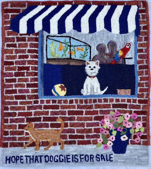 How Much is that Doggie in the Window?, 20" x 22", #3- to 6=cut wool on linen. Includes some roving, a small gold heart on collar. Designed and hooked by Marjorie Anderson, 2018.