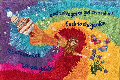“I don’t know that I can say that I have a favorite song—I enjoy so many across a wide variety of genres. I looked at the choice from a different perspective: what new things can I do/learn? Although I have dyed wool before, I had just purchased the Wooly Mason Jar dyeing system with Majic Carpet dyes and thought this would be a great chance to use/learn it. I wanted to do something colorful and I had never hooked any lettering, and that could be a natural element to incorporate. As I was musing over what song to choose, Woodstock (Joni Mitchell, 1969) come up in a play list. I realized the 50th anniversary of Woodstock was in 2019. I listened to the words and I couldn’t help but notice how the song seemed applicable again. So the design, based on the refrain, “We are stardust, we are golden, and we’ve got to get ourselves back to the garden,” popped into my head. As a nod to the upcoming 50th anniversary of Woodstock, the seemingly current relevancy of the song, and with the thought that I could create a wildly colorful 1960-70s tie-dye style psychedelic background, I knew I had found my inspiration in Joni Mitchell’s Woodstock song.” -
