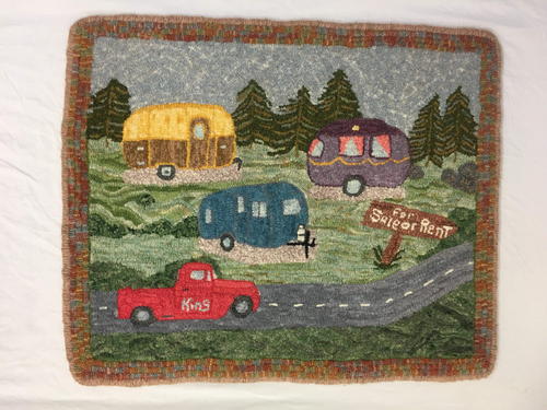 “When I was young my parents would take us on Sunday drives. The radio in our car never worked so my mom would sing to us, old country songs. This was my favorite. I had to think outside the box and challenge my skills to try something new, like landscapes. I have been hooking rugs for 4 years and I do not belong to a rug hooking group; I taught myself with the help of online videos. The groups of women in my Facebook groups have been very encouraging, helpful, and kind. So for the love of rug hooking, Sunday drives, old country music, camping, and Mom, I created this mat.” -