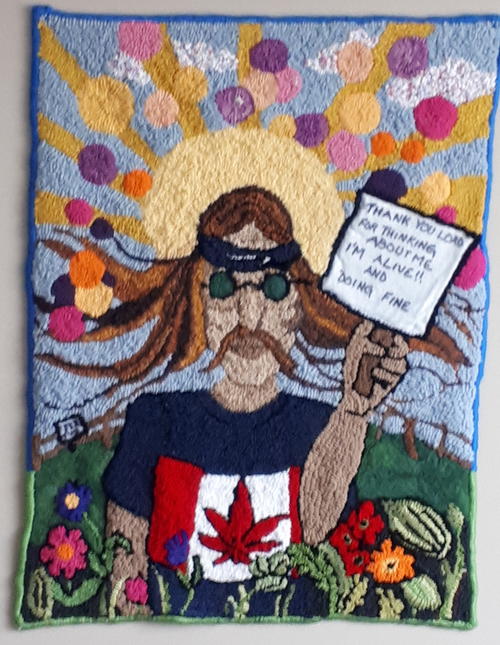 “And the sign said long-haired freaky people need not apply.” Originally recorded in the 1970s, I think even after all this time the lyrics are still relevant today. I had originally designed a peace sign on his t- shirt but changed it to a Canadian flag bearing a marijuana leaf as I was hooking this on October 17, the day Canada legalized marijuana—a present day “sign of the times.” I used to dance to this song with utter abandon and felt free.” -