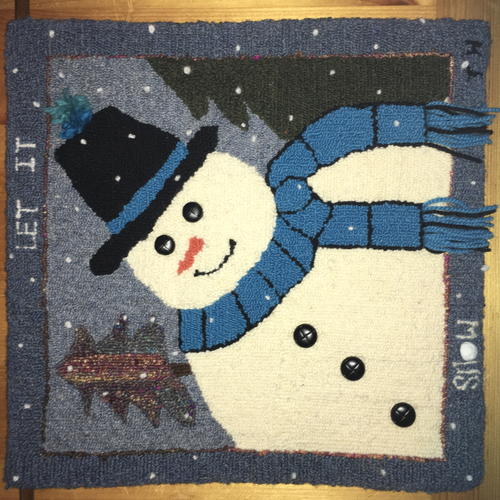 Let it Snow, 14" x 14", yarn on cotton rug warp. Designed and hooked by Tina Hayes, 2018.