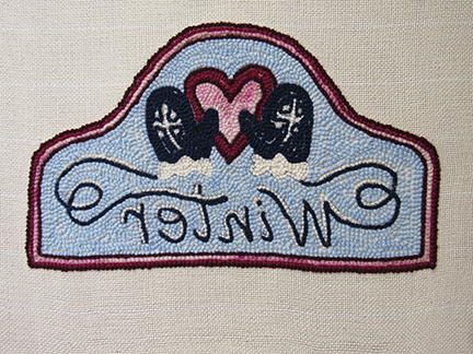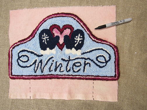 Now it’s time to punch the mitten strings that create the word WINTER. Use the navy blue yarn and punch the mitten string, making nice short, even stitches. If your stitches get too far apart, your single line will start to appear broken on the finished side, so keep those stitches fairly close. As you create the letters, make crisp turns with the punch needle in the down position to help keep your loops an even height. When the letters are finished, add highlights using the white. Refer to the photo for placing the highlights. I think they look like a pretty dusting of snow on the letters, don’t you?