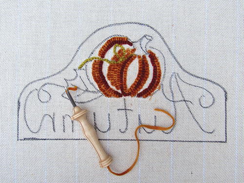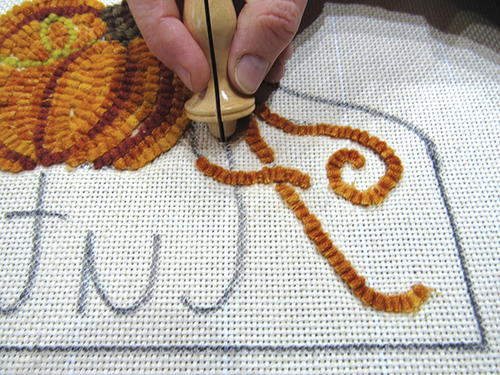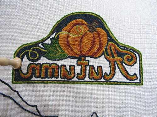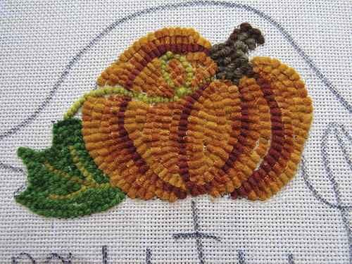 Sometimes we need to create a holding line for small details while we punch the surrounding area so that we don’t accidentally fill the space with loops. Thread your Fine needle with some fine yarn and punch the curlicue vine that is overlapping the pumpkin to create a holding place. It doesn’t matter what color you use, as we will pull it out later and re-punch it, which will make the line crisp and clear.