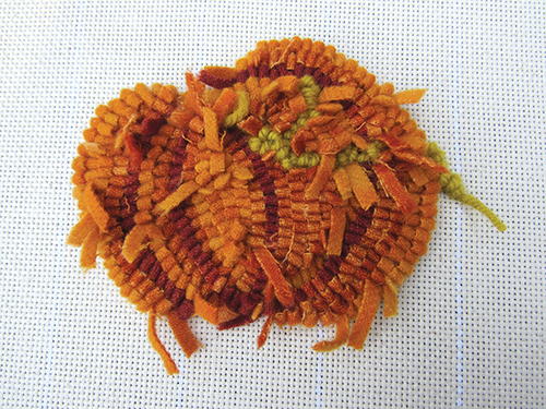 Next, thread the needle with medium burnt orange and punch the area marked MBO. Follow the curve of the pumpkin as you punch. The direction of your rows of punching enhance the shape of an object, and this is heightened even more when using wool strips. Now thread your needle with the light burnt orange and punch the final areas of your pumpkin, creating highlights on the curves and in the middle of the center rib. Don’t jump over the loops of the vine; instead stop, cut, and restart each time.