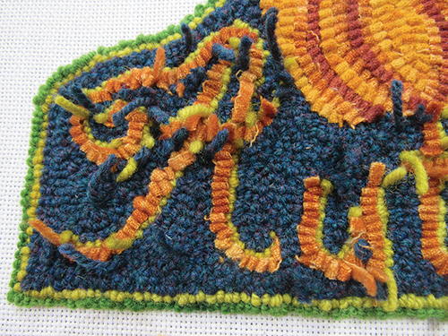 Combining wool strips and yarn in one piece is a great way to add interest and texture and, with practice, it is just as easy to punch wool strips as it is to hook with them.