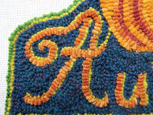 Now it is time for letters! I know many people are nervous about lettering, but the punch needle makes it so easy to do. Online calligraphy stroke charts can be a fun way to study the steps to letter formation, although it isn’t necessary. Using the #10 Regular and medium burnt orange strips, start on the letter A. Punch the first down stroke of the A, then punch the curved part, starting at the top and heading down. Remember to turn your needle as you travel so the loops form a nice arc over the top of the A and in the curly flourish. Punch the crossbar. Have a look at your letter on the other side. You may need to tweak a loop here and there. Don’t worry about making a mistake: you can always pull it out and try again, especially on monk’s cloth. Carry on punching the letters in this way, following their outlines.
