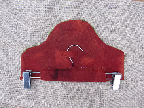7. When the binding is secure, place the pants hanger over the back of the piece so the hanger bar aligns with the bottom edge. Fold the rectangle of wool up and over the hanger bar and secure it with a hook-and-loop fastener. Adding another little bit of fastener or a loop of wool near the top of the hook will prevent the hanger from tipping forward. Alternatively, glue the wool rectangle over the hanger and add a little tiny rectangle of wool over the hook.