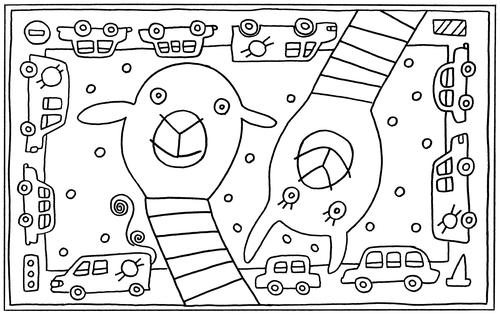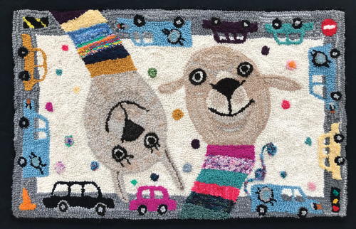 I designed the rug with my daughter Isa—we often collaborate, and I love using her drawings in my projects. In this case we knew we wanted to represent the local alpaca ranches, so alpacas became the focus of the design. It was Isa’s idea to have the alpacas wearing striped turtlenecks with each stripe punched with yarn from one of the shops I visited. I finished off the design with a border of yarn crawl-inspired vehicles, including a rumored limousine carrying mimosa-
