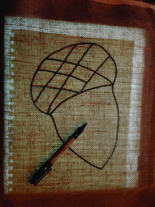 Transfer the acorn pattern to a foundation of your choice. Add 4" on each side of your pattern to allow enough room for the grippers on your frame to grip it and enough foundation for you to whip it. Use duck tape (not duct tape) available in fun prints and colors to keep your foundation edges from unraveling. Gone are the days of zigzagging or serging edges. This modern new method works fine for me. Lay a length of tape the length of your foundation, sticky side up, then line up and ever-so-gently stretch and straighten the foundation. Lay the foundation evenly and gently on the tape. The linen should cover one half of the width of the tape. Fold the remainder of tape forward and gently press to stick it to the front of the foundation. Now you have sound and sealed edges.