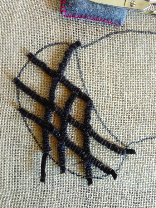 Hook the crosses in the top first using strips of wool or yarn. Then use directional hooking as you fill in the acorn and the cap.