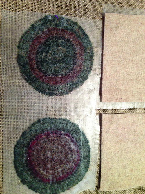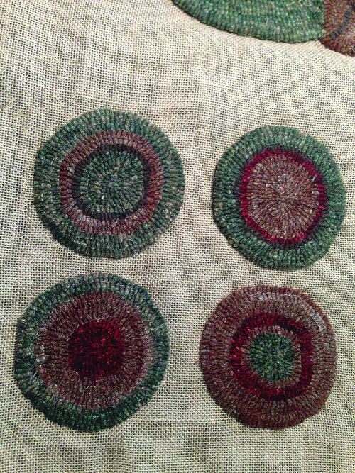 Fill in the diamond shapes with your dyed chestnut yarn or wool. Begin your loops next to the dark outline, hook up to the corner, turn, and hook down the next side, row by row, working your way in until you are into the center. You are not only filling a space, but you are also leading the viewer’s eye around the piece with the direction of your loops. Now hook the acorn bottom with the evergreen yarn or wool. Pay attention to the direction of your loops: start on the outside and work your way in. I hooked several rows on one side and then switched to the other side to keep the flow of the loops even. Continue on until the acorn is complete. I had a good bit of linen left over and plenty of matching wool, so I hooked coasters to match the trivet. Trace a can or cup for a circle, start hooking on the outside, and work in, loop by loop. The red in the coasters was the two pockets of the skirt, dyed in a wee bit of red.