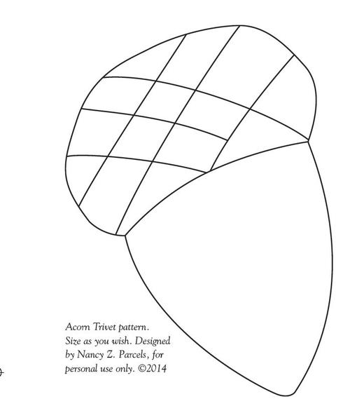 You can hook this clever design with wool yarn. Gather your colors of yarn together so that you have them nearby. Now you are ready to start the hooking. If you are hooking with yarn, be sure that the yarn is heavy enough to hook well. Rug weight yarn works well, or try using 2 or 3 or 4 strands of lighter weight wool bundled together as one strand. Begin by hooking the crosshatch lines in the top of the acorn. Use a dark color of yarn or wool here. Because this mat will be used as a trivet, it is okay to cross over your wool in the back when doing these lines.