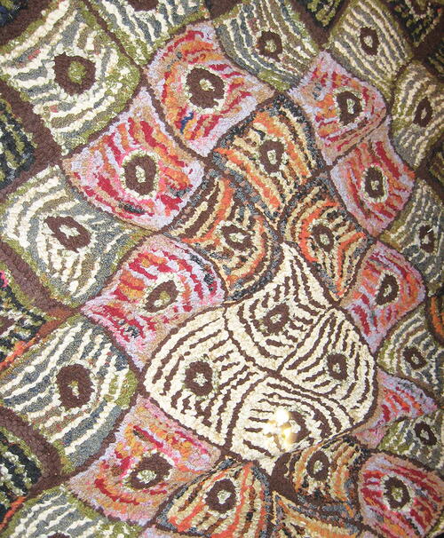 Unfortunately, the history of the Duncan design, and even the name, is murky. Its number in the McGown system is 809, telling us that it is from the 1970s and not earlier, as it might appear to be, but no more information is available. Eric Sandberg told us he felt it was Pearl’s interpretation of a log cabin quilt design, leading him to his choice of a hit-or-miss palette and traditional red for the circles. I have always believed it was based upon a quilt, although I’ve never seen a quilt just like it. In any case, it’s a dynamic, rhythmic, and playful design which lends itself to endless interpretations. Most often, and logically, hooked as a checkerboard, it can also be more graphically complex or wonderfully random; carefully planned or seemingly spontaneous. Its suitability for using leftover wool makes it an appealing choice of pattern. Duncan’s charisma continues. He seduced several of our fellow hookers: members of Rug Social (Brattleboro Vermont) and/or the Quabbin Chapter of ATHA (Amherst, Massachusetts), who decided to hook the pattern along with Devin and me. These are the results. We hope to organize an exhibition of them at Sauder Village in 2023. And should you be inspired to hook your own Duncan, the pattern is available from W. Cushing & Co. in the standard 25" x 37" size and in custom sizes.