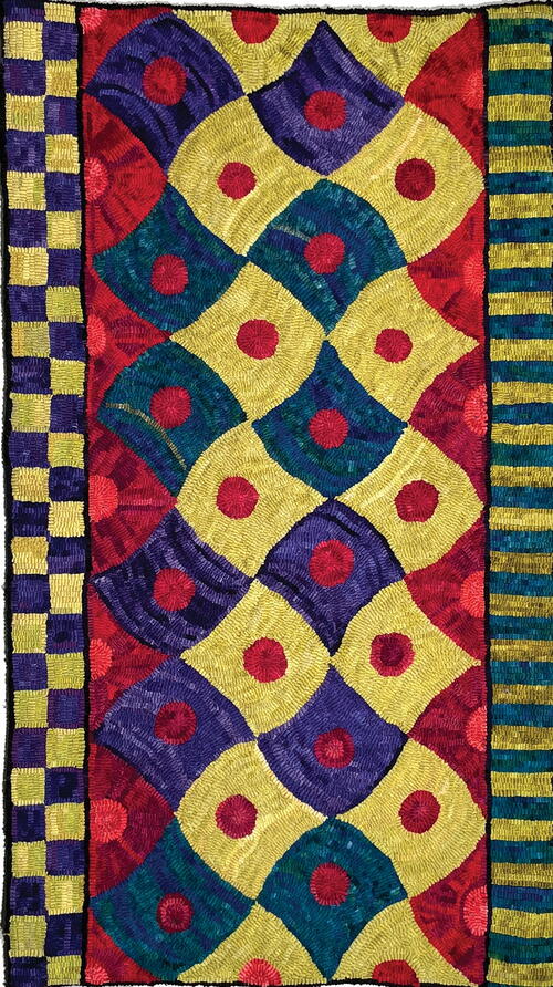Lynda had never hooked a geometric rug and, in fact, had a serious aversion to the idea. She hooks her own very creative designs but was intrigued by the challenge Duncan presented. Deciding on a yellow and turquoise palette because she “had a lot,” she began hooking and was dissatisfied with the results. Cooking the yellows and blues (separately) to blend made things much more harmonious, and she persevered; adding the purple circles made her like it better. She has a rug that her daughter loves and now she has “ticked off the geometric box.” -KRIS MCDERMET -