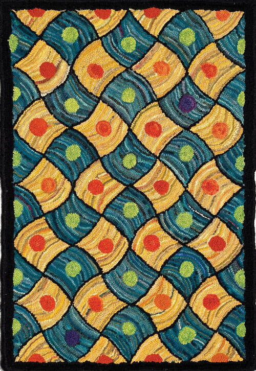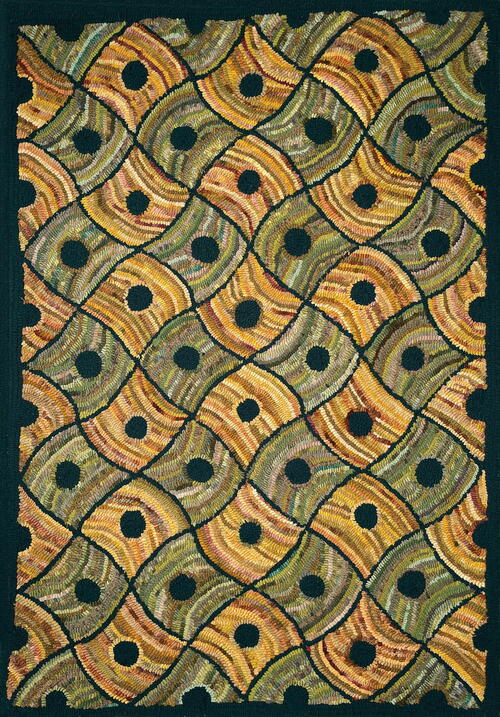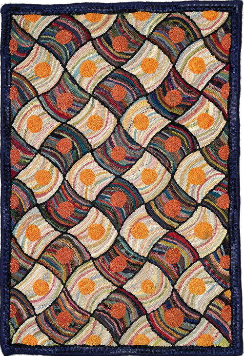 At a workshop in Virginia very early in my hooking career I met Eric Sandberg and fell in love with his rug, Duncan. Always a sucker for geometrics and a lover of antique quilts, I knew immediately that I had to hook this rug. Eric was charming and generous, and his rug, with its rhythmic movement and scarlet circles, was irresistible. I don’t remember how I learned that this was a Pearl McGown pattern, but before too much time had elapsed, I was hooking it in a workshop with Gail Dufresne. Initially I found it challenging, my inexperience causing some frustration. Then I got the hang of hooking the curving outlines, creating the checkerboard pattern, and reinforcing the rhythm of the design with directional hooking. Gail was patient, it got easier, and I enjoyed watching the pattern come to life with alternating orange dots against a hit-or-miss palette. It was a great learning rug and, although the execution is simplistic compared to what I might choose today, I still enjoy it.