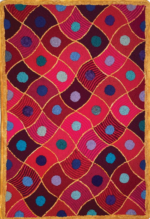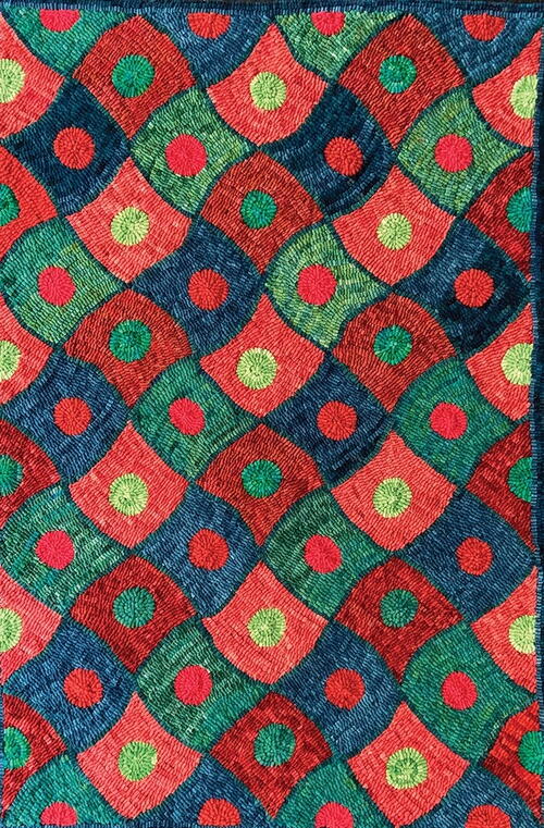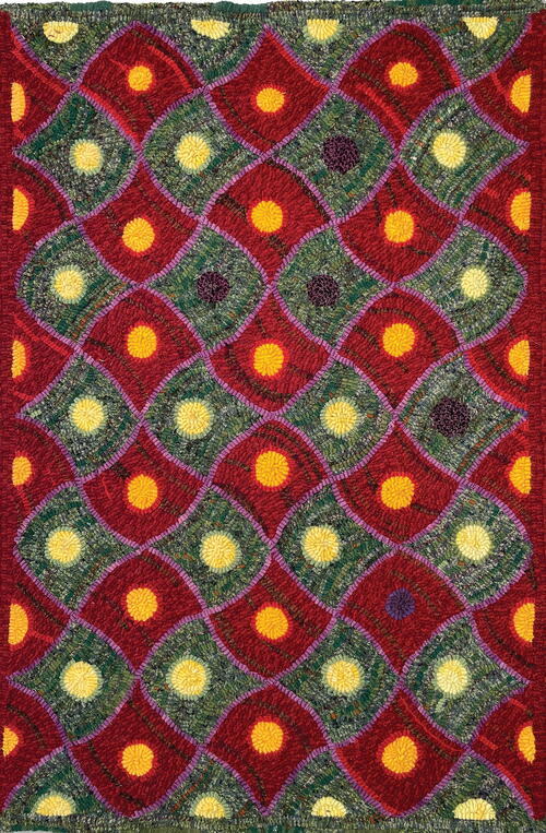 Ann’s rug is another different, “not a checkerboard” Duncan. She used her collection of reds and pinks as a springboard and then went with “a kind of triadic color plan” in a hit-or-miss rug. She remained conscious of the effect of warm tones for the squares and cooler colors for the circles and is happy with her choice of golden mustard for outlining which, with the squares with stripes, emphasizes the curves in the rug. She also scattered the colors of the circles so they would be random and not predictable. -KRIS MCDERMET -