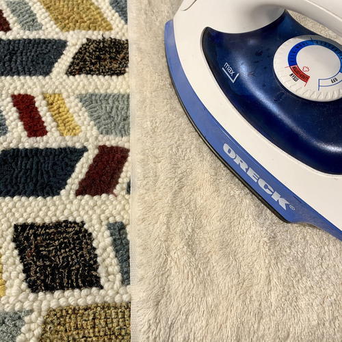 Once the loops are tidy, it is time for the very critical step of steaming the work. It is important to note that steaming only works well with yarn and strips that can handle the heat. Lay the work, loop side up, on an ironing board. Cover with a wet cloth, not damp, you want it nice and wet. A clean hand towel or dish towel works well. When punching with yarn, the rows are often much closer together than the rows of hooked loops. This density needs to be relaxed by the steam. Lay the wet towel over the work, and press your hot iron down on the towel. Be careful of the steam coming off of the work, it can be intense. A firm press of 10 seconds an area is recommended.