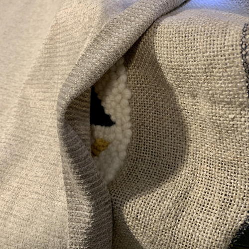 Now it is time to sew. The hooked/punched edge creates a raised section that is the perfect guideline for the sewing machine foot. A regular foot can be used, or a thinner zipper foot. Since the final look in this guide is a whipped edge, the desired foot is the regular foot. This will create an exposed area of the foundation cloth, when flipped, that is the perfect size to whip. Sew slowly along the dented fabric, as seen in the photo. Leave enough of an opening to turn the work right-side out. It is common to make the opening too small. The whipped edge will cover the opening, so feel free to make it a generous size. A pillow case has now been created. Trim off excess edge fabric. If desired, serge or zig zag stitch along the edge. This is especially important if the back fabric is likely to unravel. Linen and monk’s cloth love to unravel, so securing the edge is advised.
